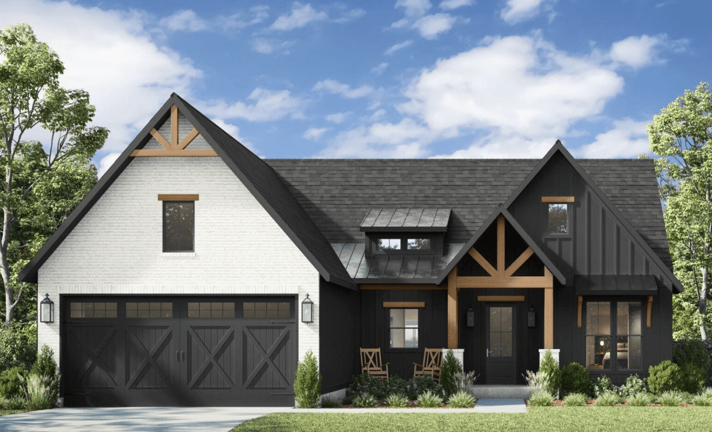A single dormer crowns the entry, timber beams frame the wide covered porch, and board-and-batten siding with antique beadboard accents brings warmth and character. The exterior feels grounded, welcoming, and timeless from the moment you arrive.